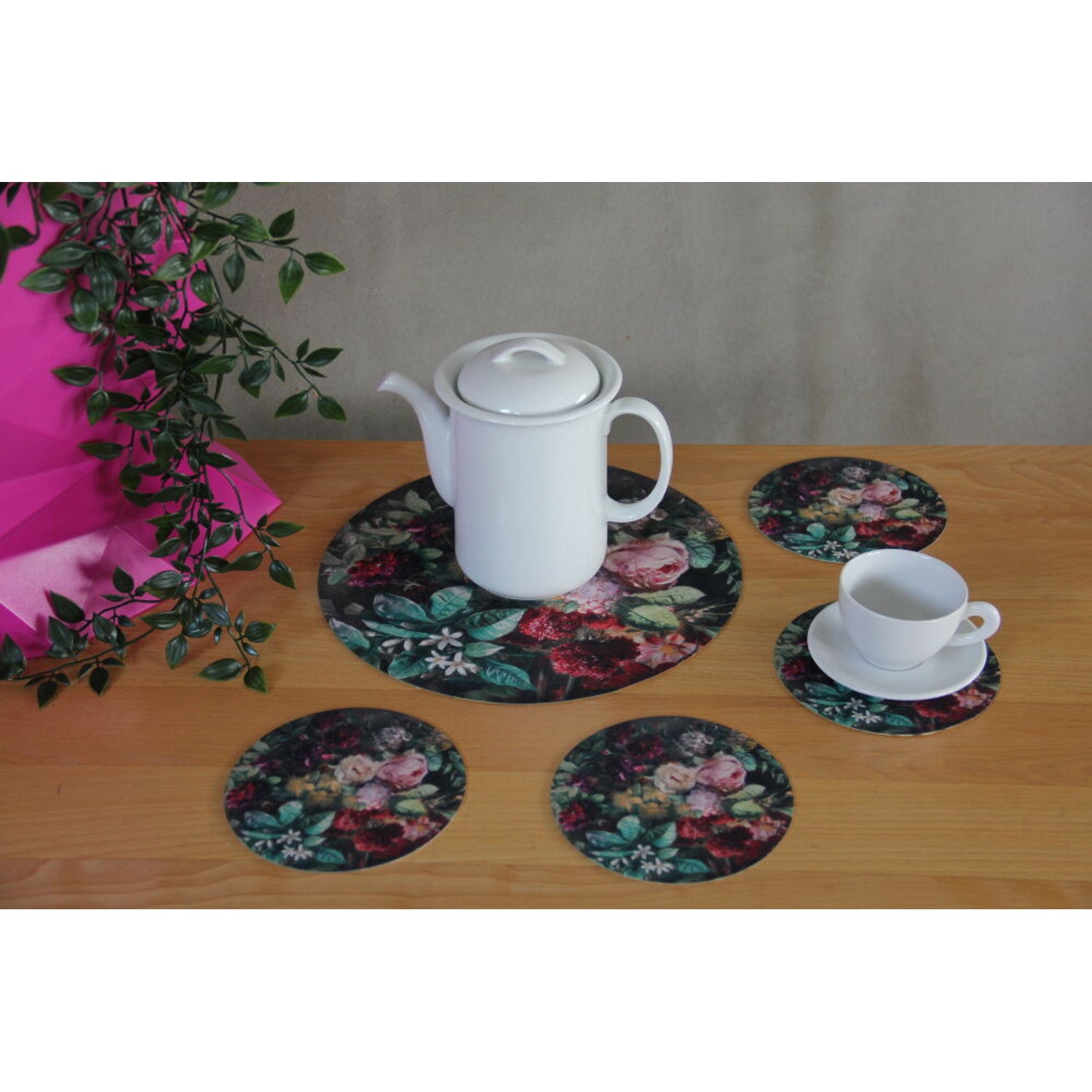 The set of 5 placemats for the table is a practical and aesthetic solution that will add elegance to any table setting. The set includes four smaller placemats with a diameter of 16 centimeters, ideal for cups or glasses, and one larger, 33-centimeter diameter, perfect as a placemat for a pot, platter or pitcher.