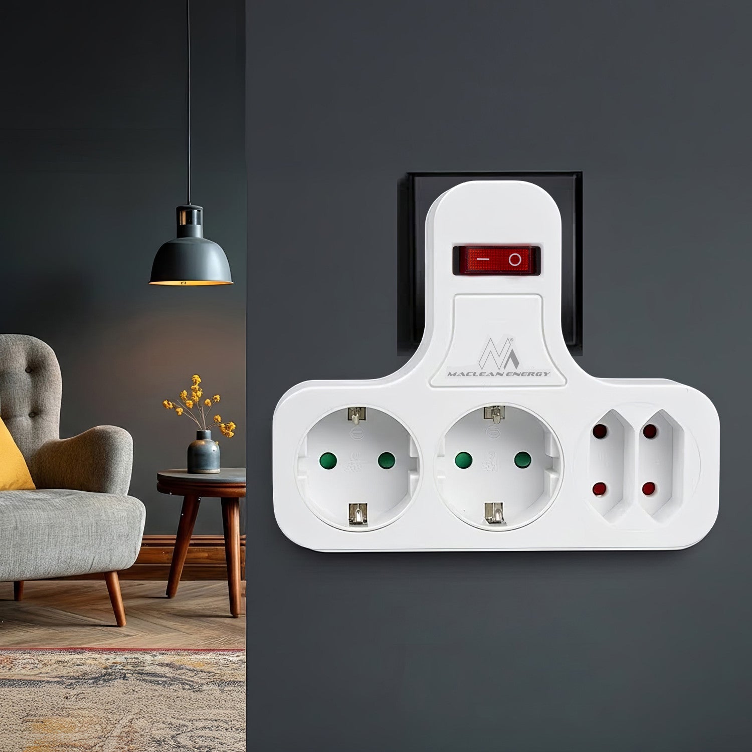 Maclean Energy MCE224 G quad socket with switch and stabilising base with two Schuko sockets and Unischuko plug.