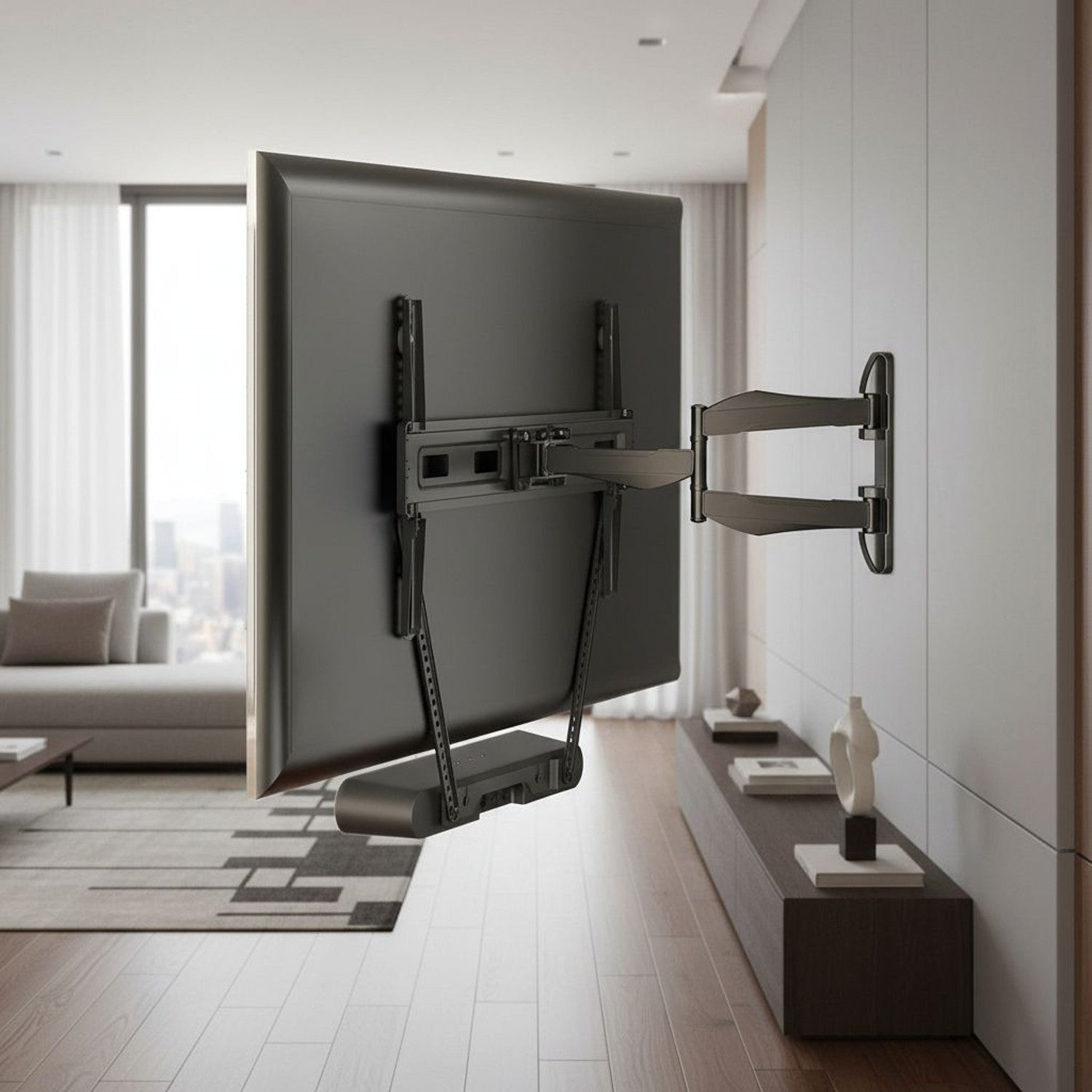 High-quality Sonos Ray speaker mount, with the ability to be mounted to a TV or to a TV bracket. Mounting the soundbar directly under the TV allows you to get better sound compared to the TV's built-in speakers. This allows you to enjoy a more immersive and clear sound when watching movies, listening to music or playing games.