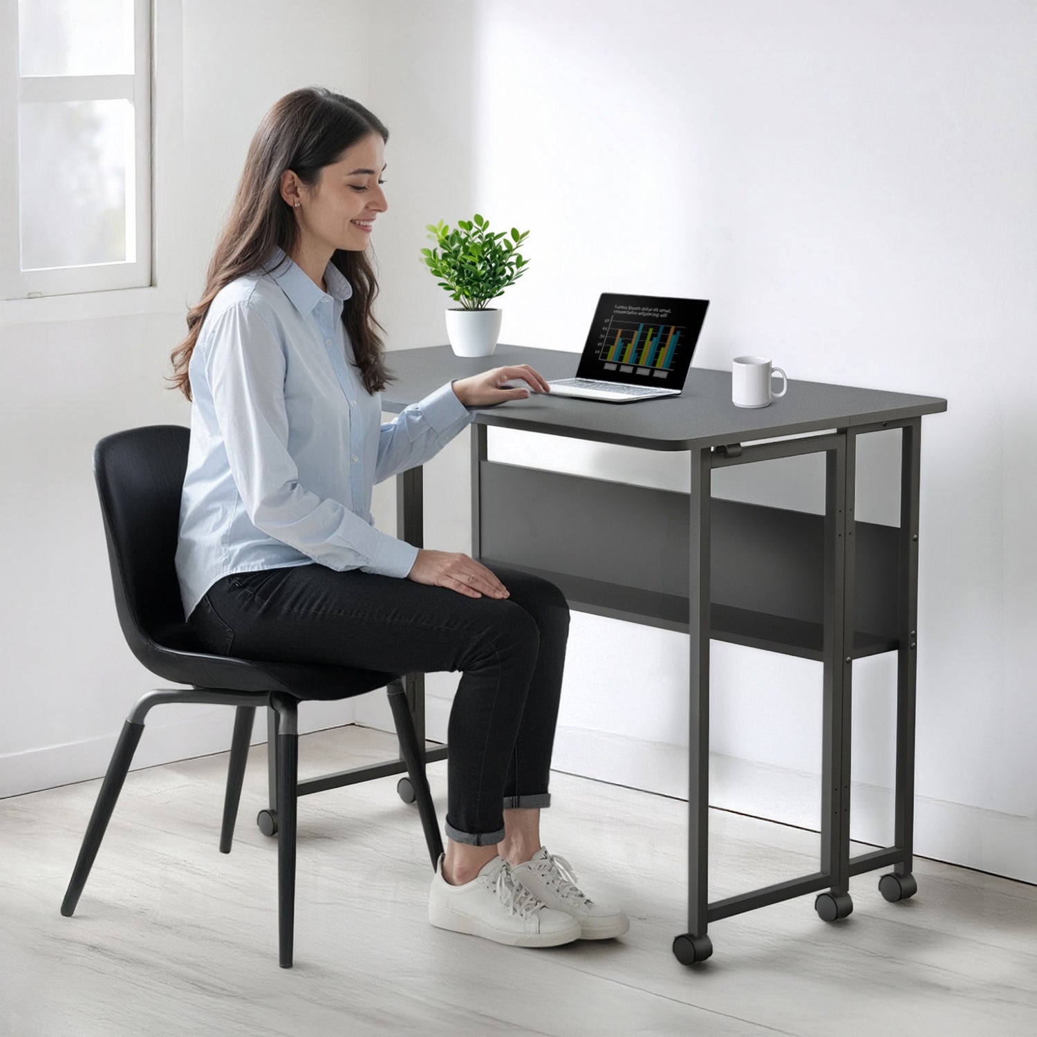 The furniture will find itself perfectly in a wide range of uses: as a computer desk, a place to study, a support table or a space for hobbies and crafts. With its folding design, shelf and mobility on wheels, the desk is a versatile choice that will work in any interior.