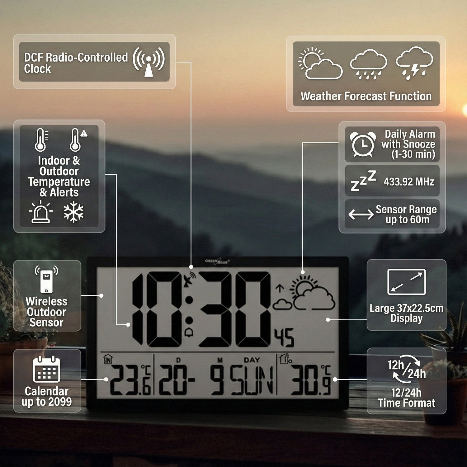 In addition to the current time, the display also shows the date, day of the week, indoor and outdoor temperature (wireless sensor included) and a graphical weather forecast.