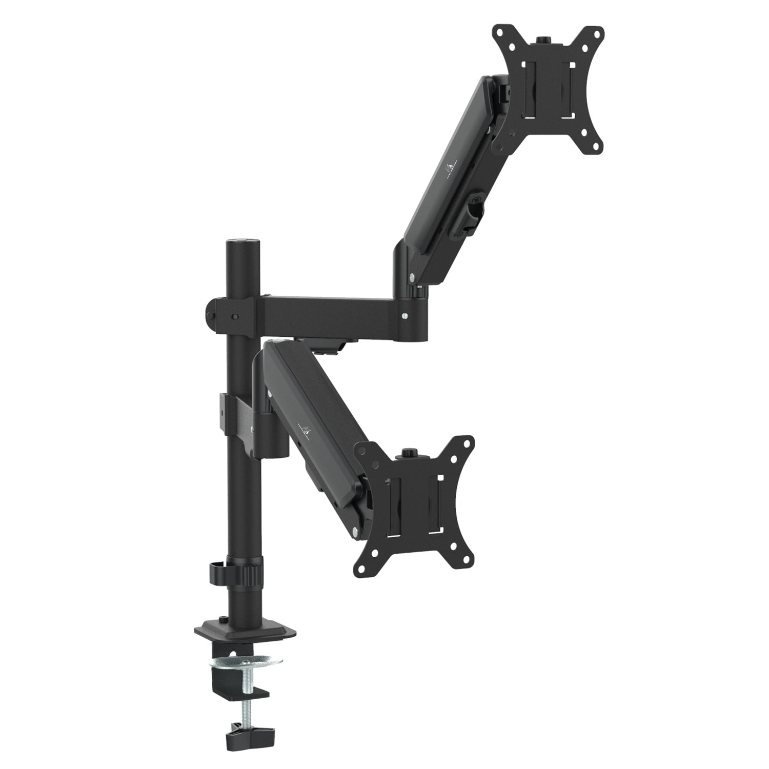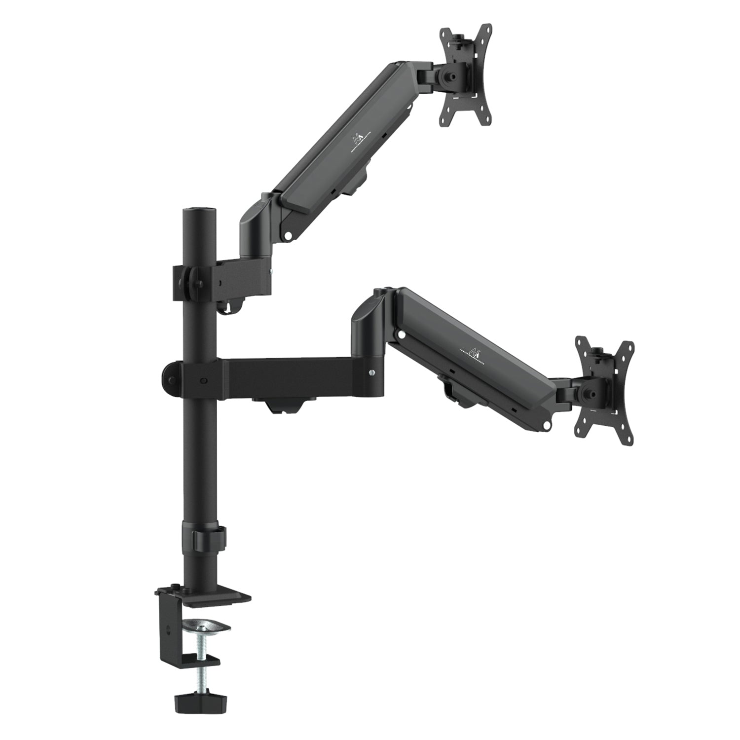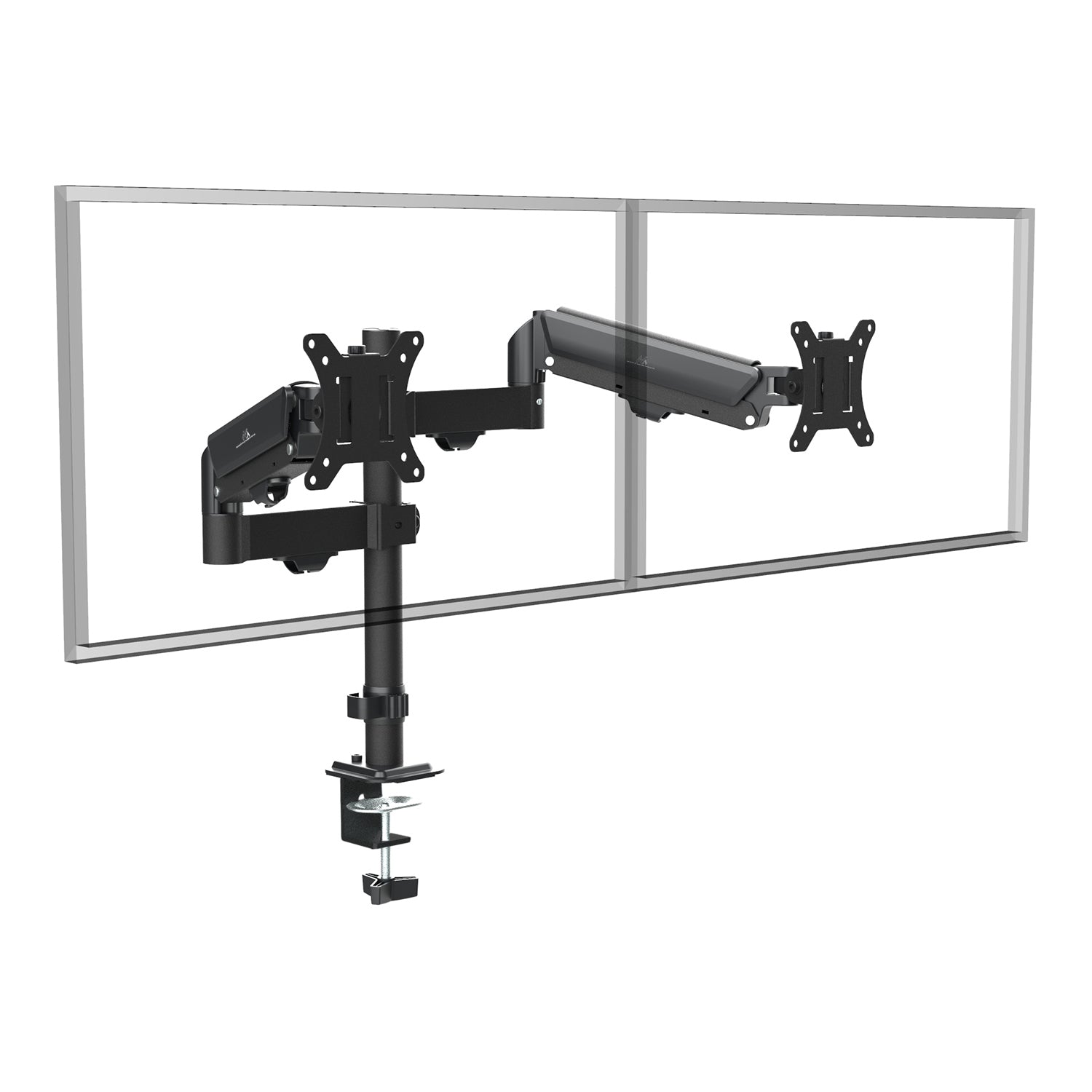 - Two independent arms with gas springs for infinite height adjustment of each monitor
