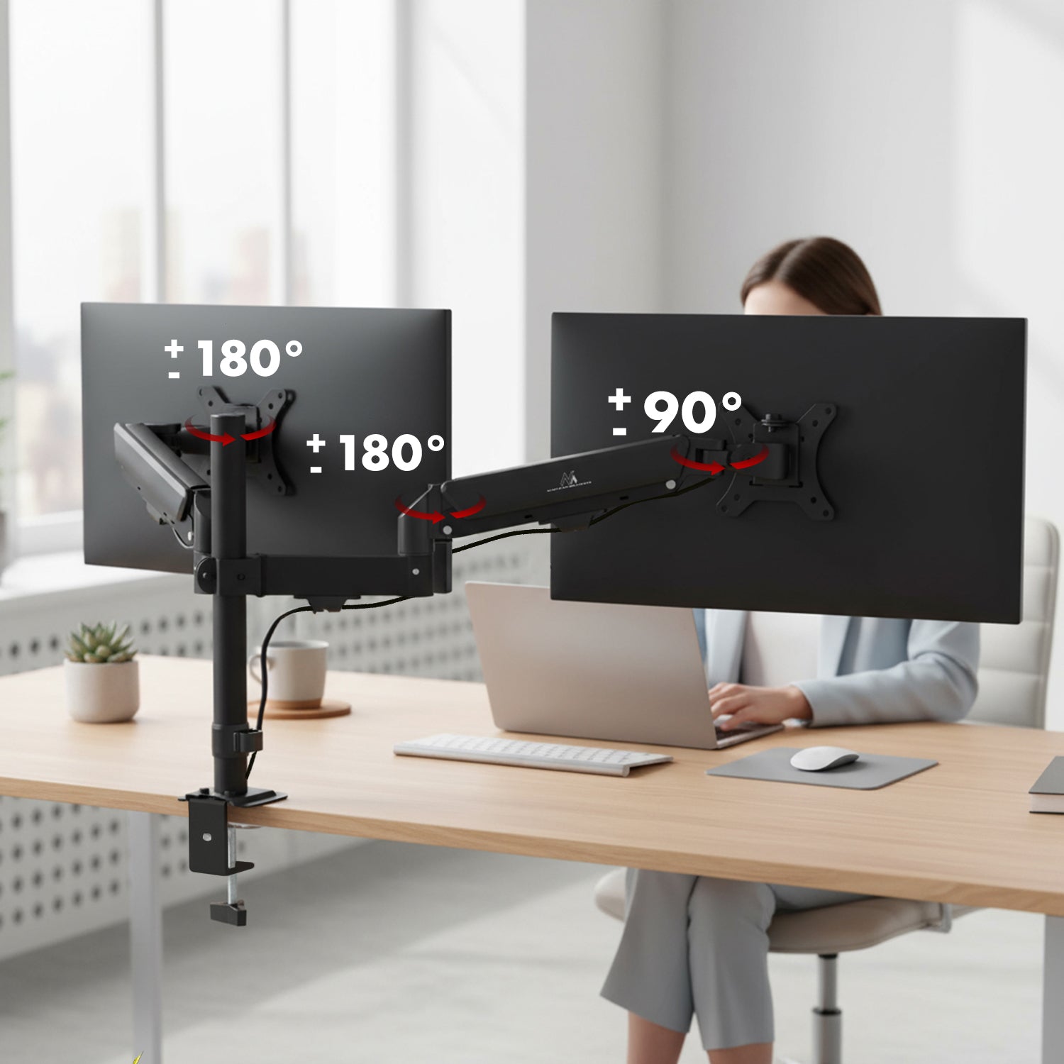 Each of the bracket's arms operates independently, allowing you to precisely adjust the position of both screens to suit your needs. The design allows you to adjust the mounting height of the arms on the pole, so you can position each monitor at a different level, adjusting their position already during installation. The tilt range of each monitor is -45° to +45°, allowing you to perfectly adjust the viewing angle and avoid reflections. The screens can be rotated sideways within ±90°, making it easy to work with the person next to you or to adjust the screens for different applications. The arms swivel both at the joints and at the post, both within ±180°, for maximum flexibility and complete freedom of positioning. With this wide range of adjustment, you can create an ergonomic, clear and fully customizable workstation that allows you to maintain a comfortable, natural posture throughout the day.