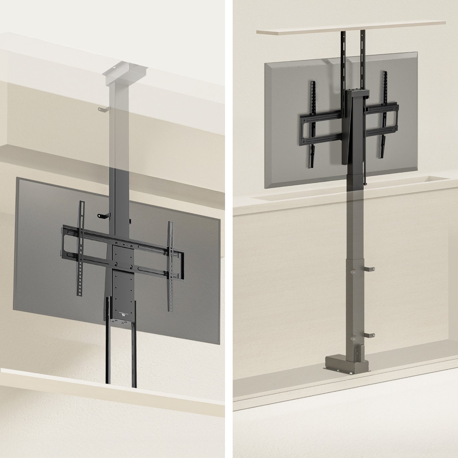 The Maclean MC-125 electric ceiling/floor mount is a modern solution that combines functionality, convenience and aesthetics. Thanks to the use of an advanced electrical system, the TV can be automatically extended from the floor cabinet, as well as lowered from the overhead cabinet, which allows for a perfect fit to the user's needs. This practical solution will work well both at home - in the bedroom, living room or media room - as well as in offices, hotels or commercial spaces where ergonomics and aesthetics matter.