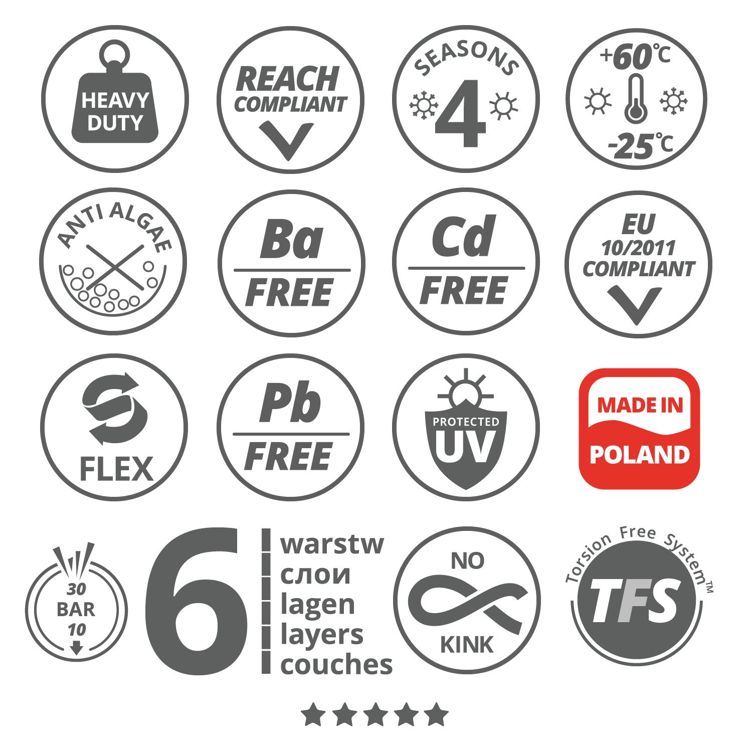 The hose is resistant to UV radiation, extreme temperatures (from -25°C to +60°C) and algae buildup inside the hose. Thanks to its exceptional flexibility and resistance to mechanical damage, it is a reliable choice for amateur gardeners and professionals alike.