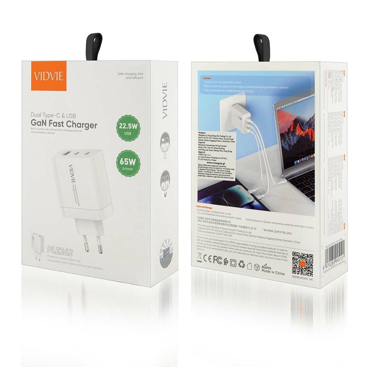 VIDVIE mains charger, 3A, 65W, 2x USB-C, 1x USB, USB-C/USB-C cable, PLE262