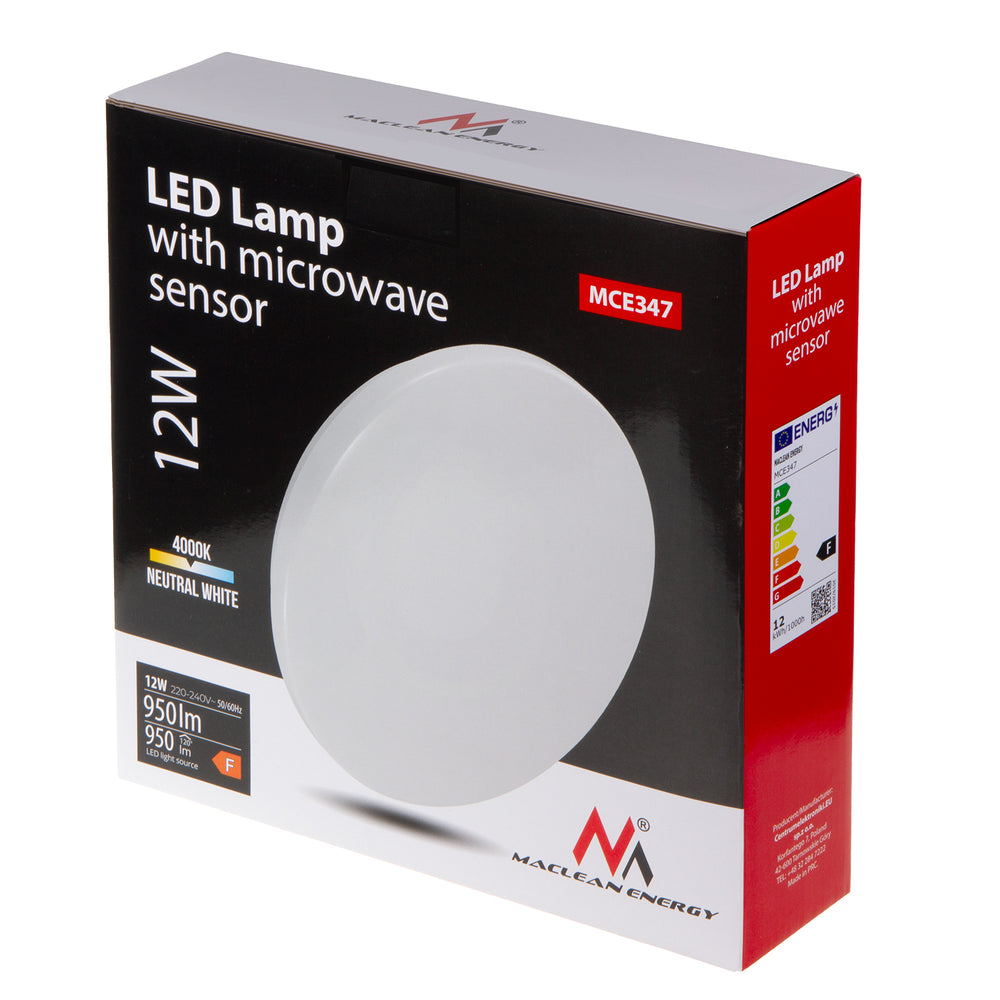 Maclean MCE347 ceiling LED sensor lamp. Equipped with a 5.8GHz microwave sensor, it emits a 4000K light with 12W power and 950lm brightness. With an IP44 rating, it ensures durability and reliability in various environments.