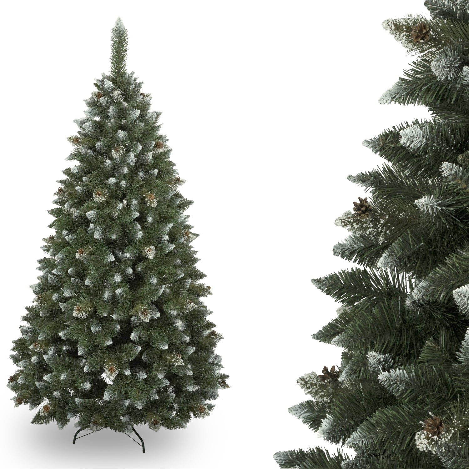 The Diamond Pine artificial tree, made of PVC, with its natural green colour and brown tree branches is perfect for decorating your home around the holidays. The pine needles are about 4 cm long, making the tree very bushy and dense. The branches of the tree are fixed on double steel wire so even heavy ornaments can be hung in the tree. The pine is decorated with white diamond flakes that imitates real snow, and some branches are covered with white paint that doesn't peel off. To give a natural look, we added natural pine cones that are permanently attached to the tree.