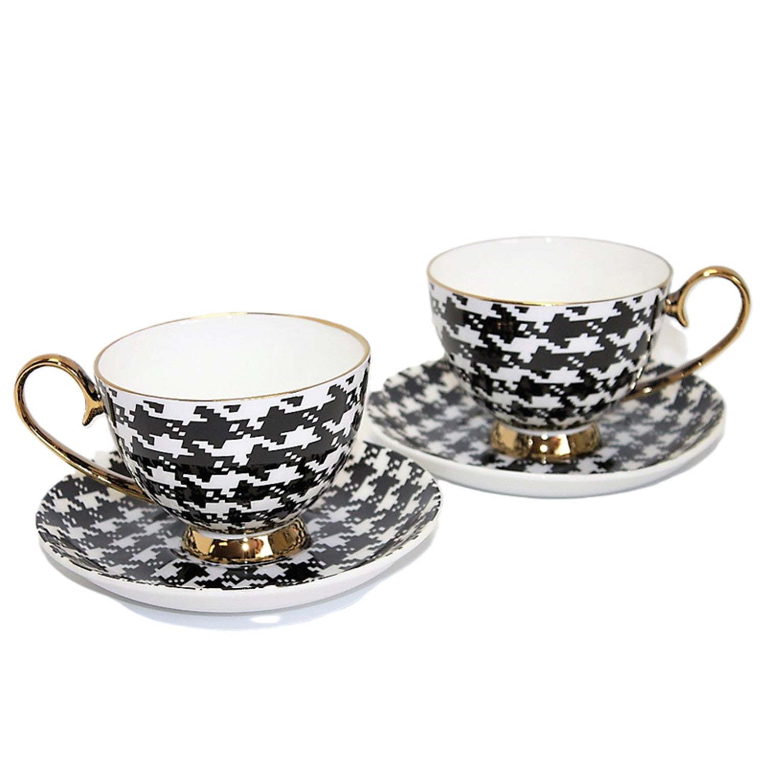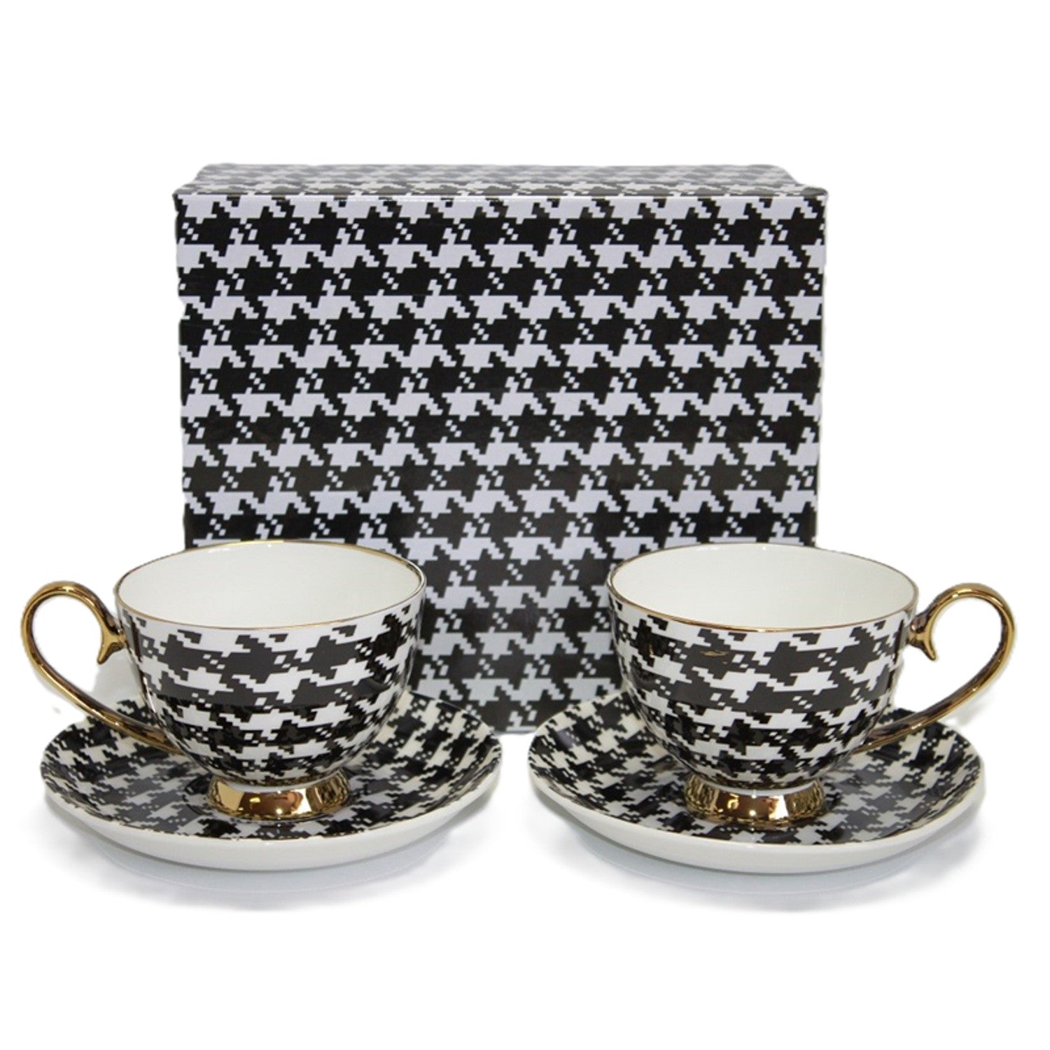 Each cup and plate in this set has been carefully crafted from the highest quality porcelain, guaranteeing durability and elegance. The black and white pepitas add a unique touch, accented with gold rims and handles that add a touch of glamour and prestige.