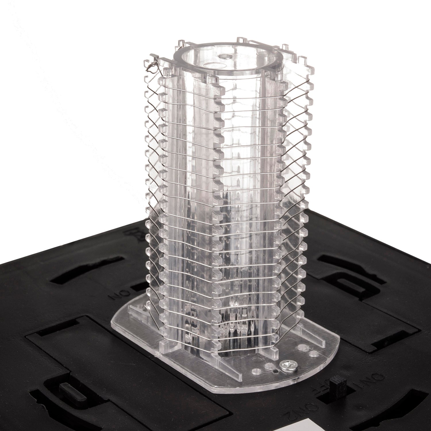 Method of operation: the lamp attracts insects with a human-safe violet LED/UV light, after which the mesh surrounding the light source razes them with electricity.