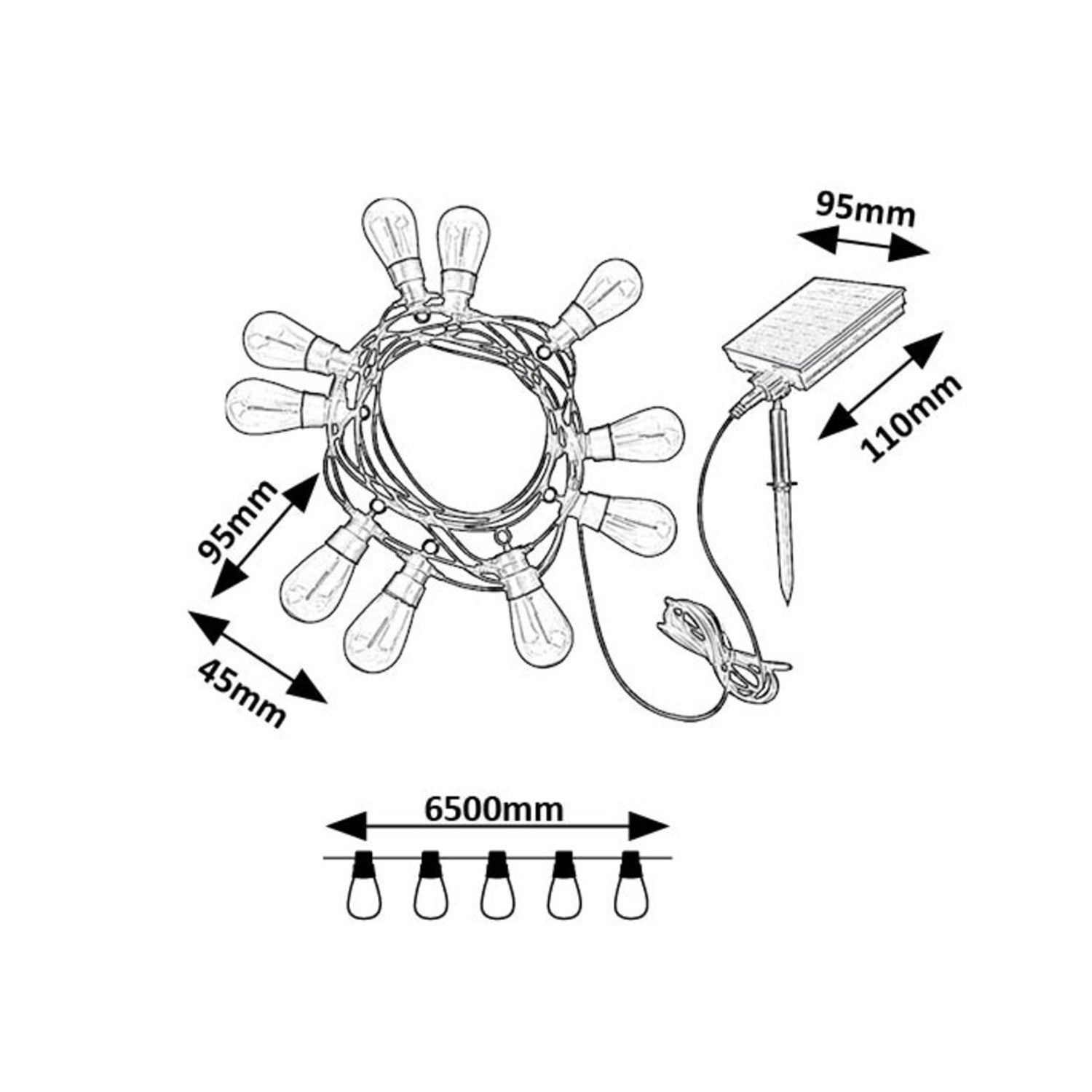 The string lamp is equipped with a rechargeable battery that charges in 6-8 hours and runs for 8-10 hours on a single charge. The solar lamp is protected from the ingress of solid particles of 1 mm or more in diameter and from water splashed from any direction.