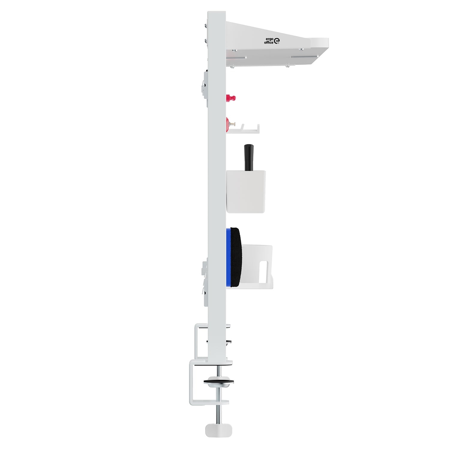 The ER-300 multifunctional desk extension is a compact and extremely practical solution for people who want to organize their workspace and have all the necessary accessories at their fingertips. The design attaches to the tabletop with sturdy metal clamps to ensure stability without the need for drilling. A narrow top shelf running the full width of the extension is ideal for small items such as notes, decorations or an office organizer.