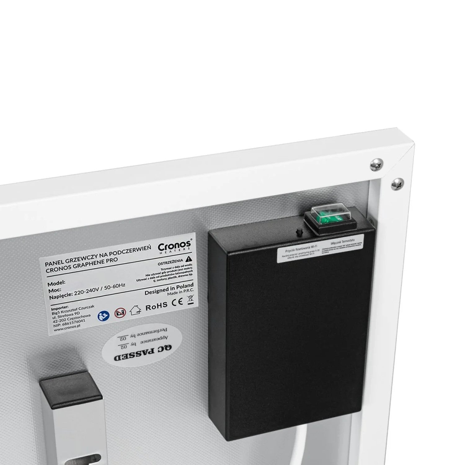 The Cronos Graphene PRO infrared radiator features an ultra-thin design with a thickness of just 2 cm, making it one of the most compact devices on the market. Such a slim design makes the infrared heater not only fit perfectly into modern, minimalist interiors, but also saves space."