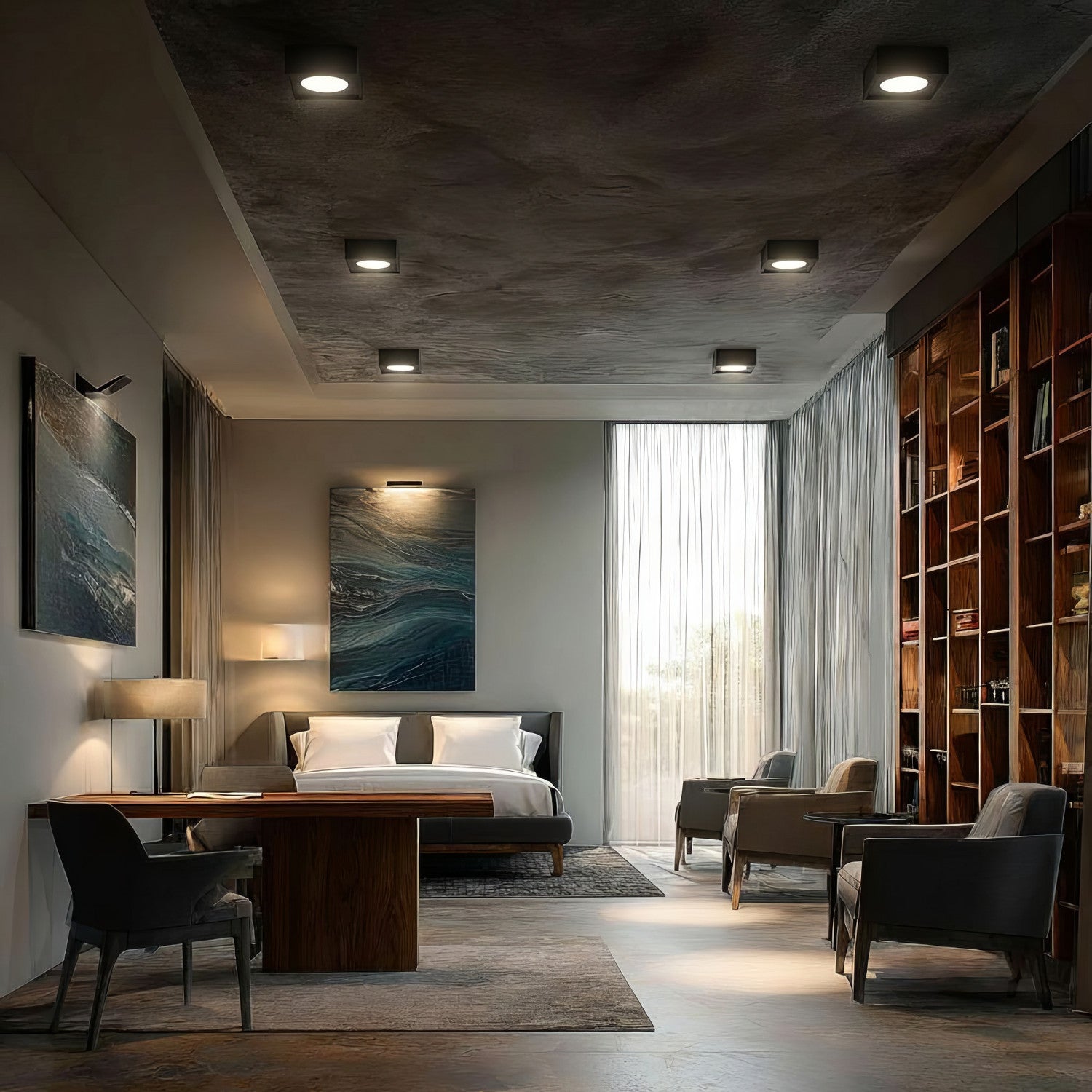 Tá píosa amháin beartaithe le haghaidh seomraí beaga, is féidir leat na soilse cuasaithe a chur le chéile i socrú grúpáilte chun seomraí níos mó a shoilsiú.