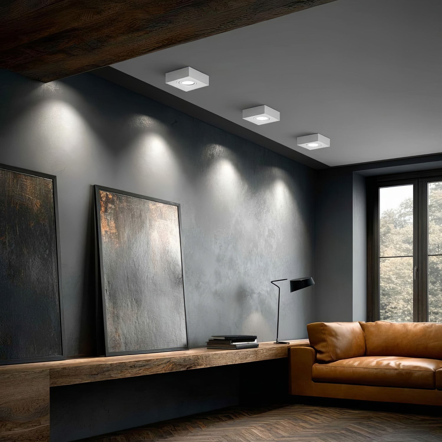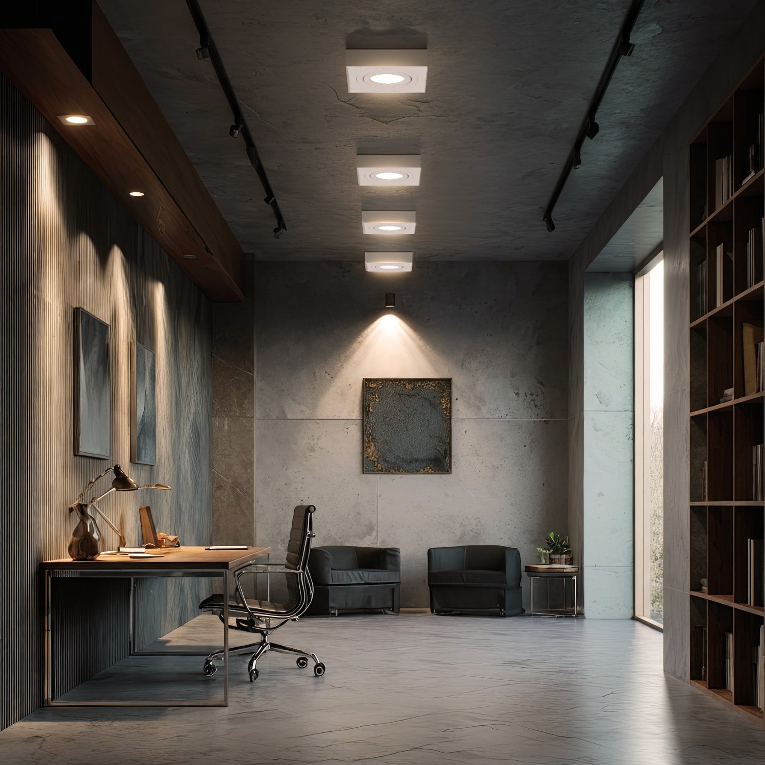 Tá píosa amháin beartaithe le haghaidh seomraí beaga, is féidir leat na soilse cuasaithe a chur le chéile i socrú grúpáilte chun seomraí níos mó a shoilsiú.