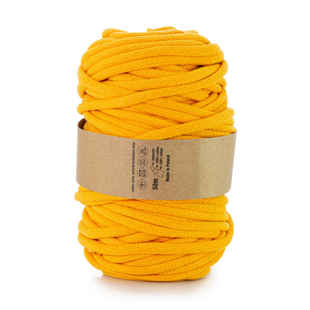 ColiNeas flätade bomullssnodd med en kärna av bomull. Denna snodd, med en tjocklek på 5 mm och en längd på 100 m, tráths av en underbar ljusgul nyans, som kombinerar både hållbarhet agus charm.