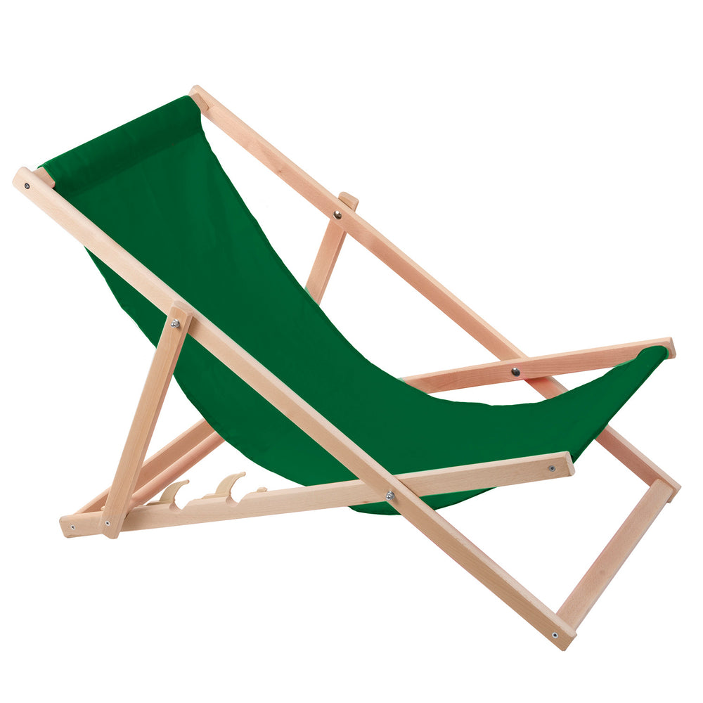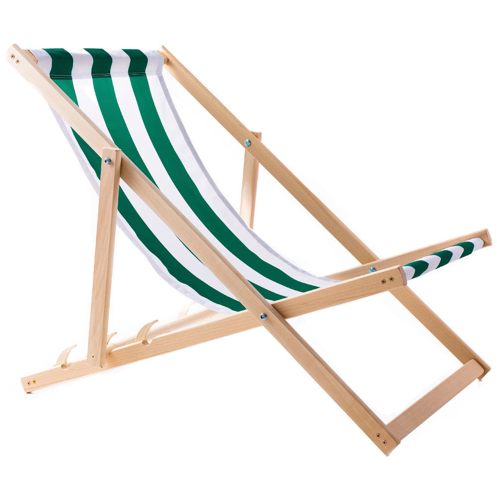Dhá chathaoir deic adhmaid chompordacha i ndath glas, foirfe le haghaidh scíth a ligean ar an trá, ar an mbalcóin nó ar an ardán.