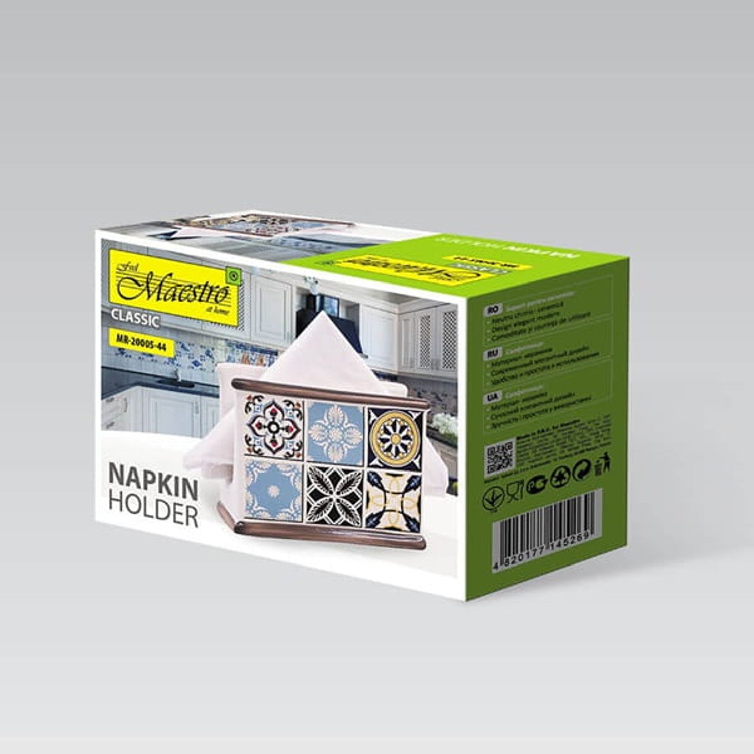 Cuir cuma uathúil seomra bia ar fáil do d'aíonna tríd an Sealbhóir Naipcín Ceirmeach 'HOLIDAY IN PORTO' ó Maestro a bhronnadh orthu. Déanta as ceirmeach ardchaighdeáin, is meascán foirfe feidhmiúlachta agus galántachta é an sealbhóir naipcín seo.