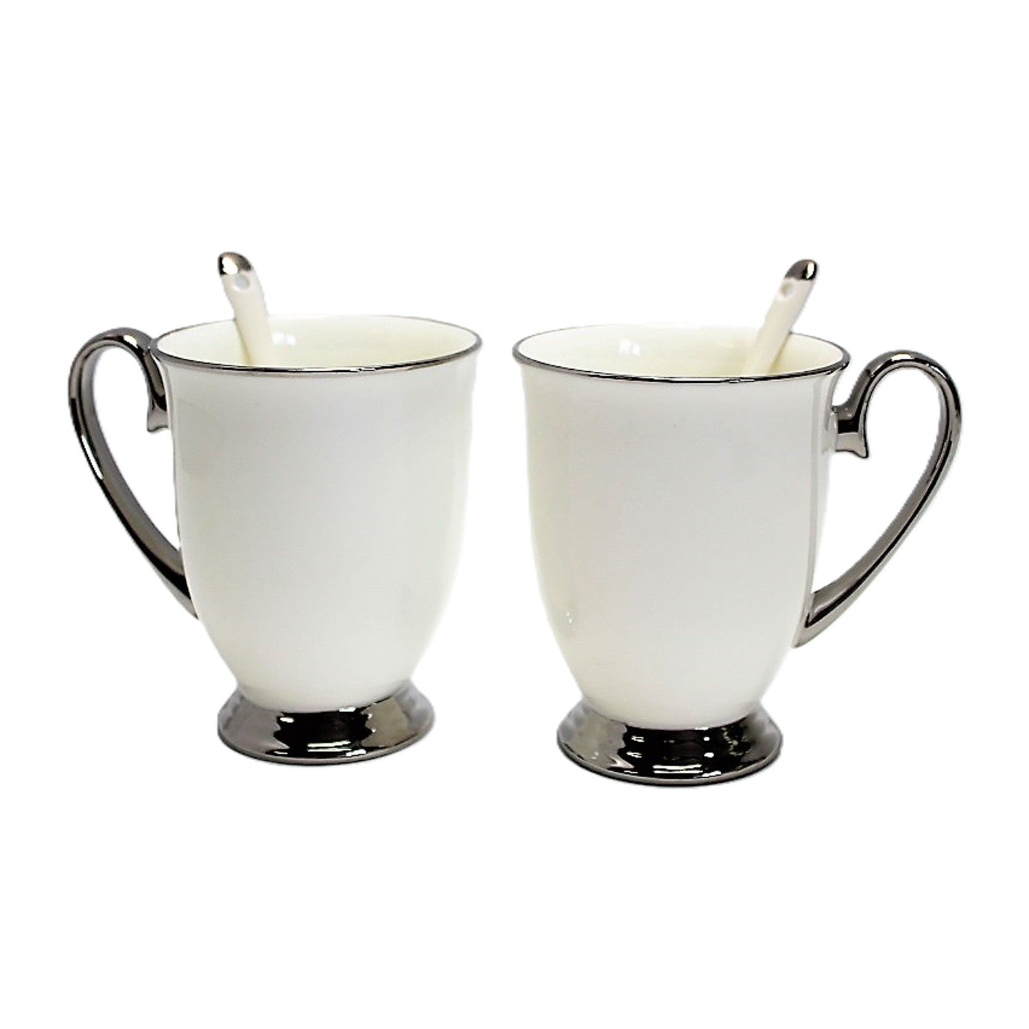 White 2pc Cups Chrome Handles, Teaspoons, Porcelain, Elegant, Queen Isabel